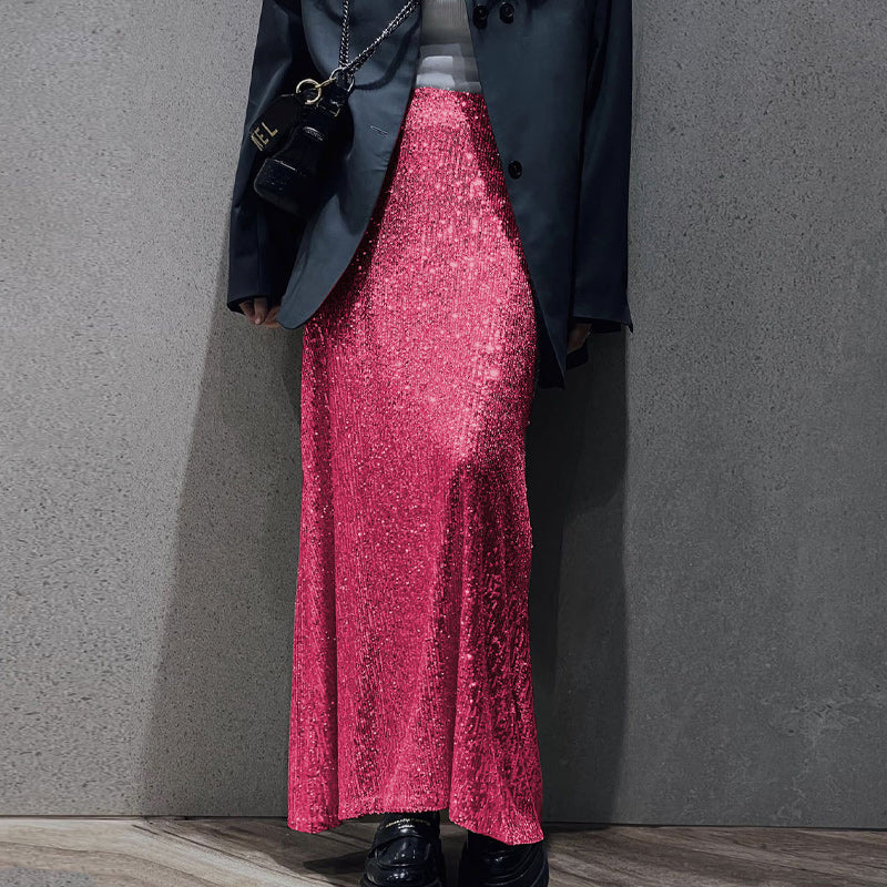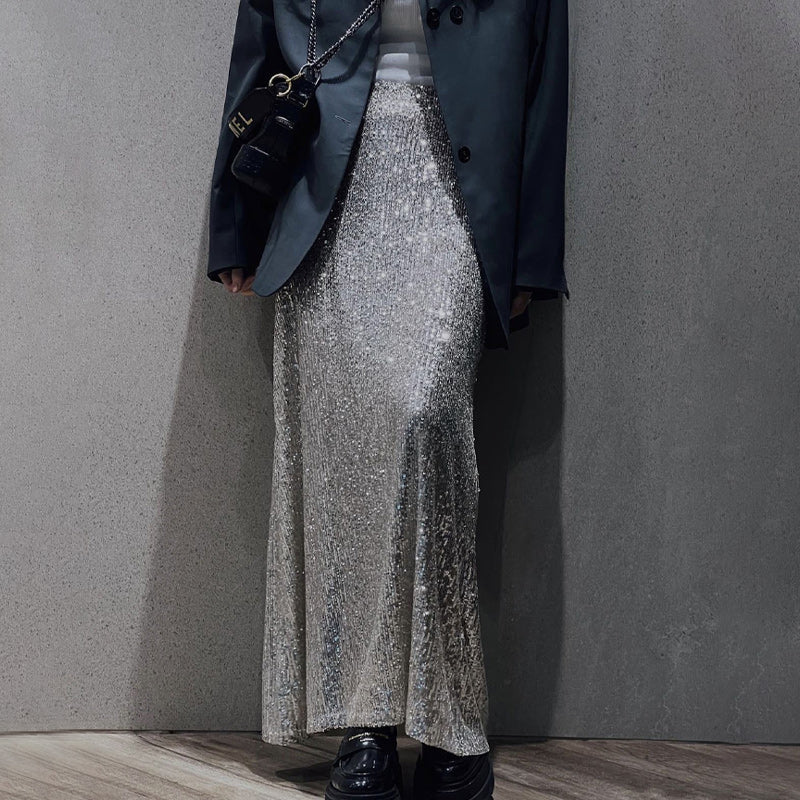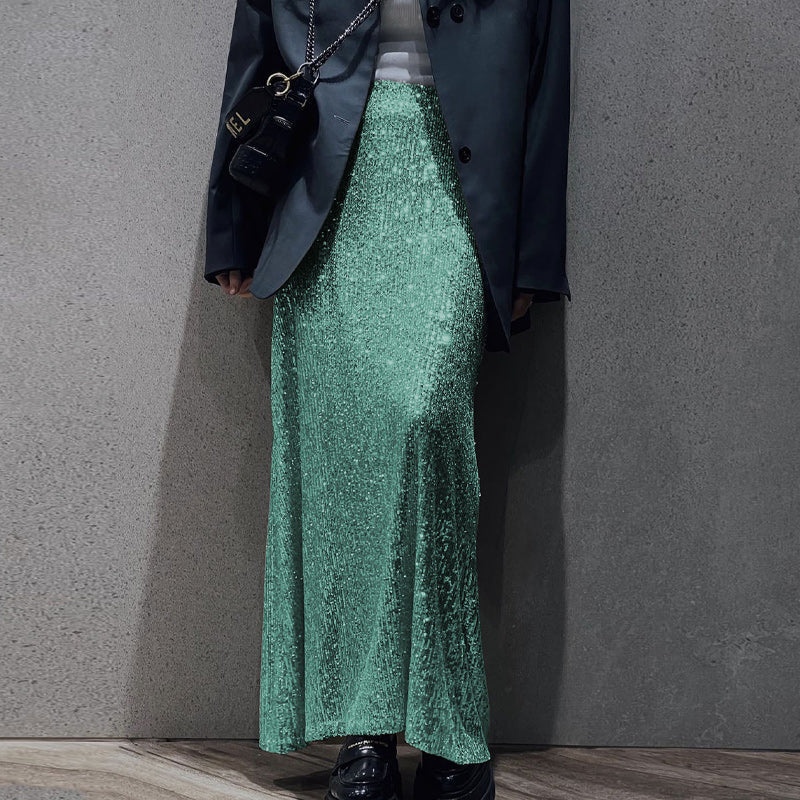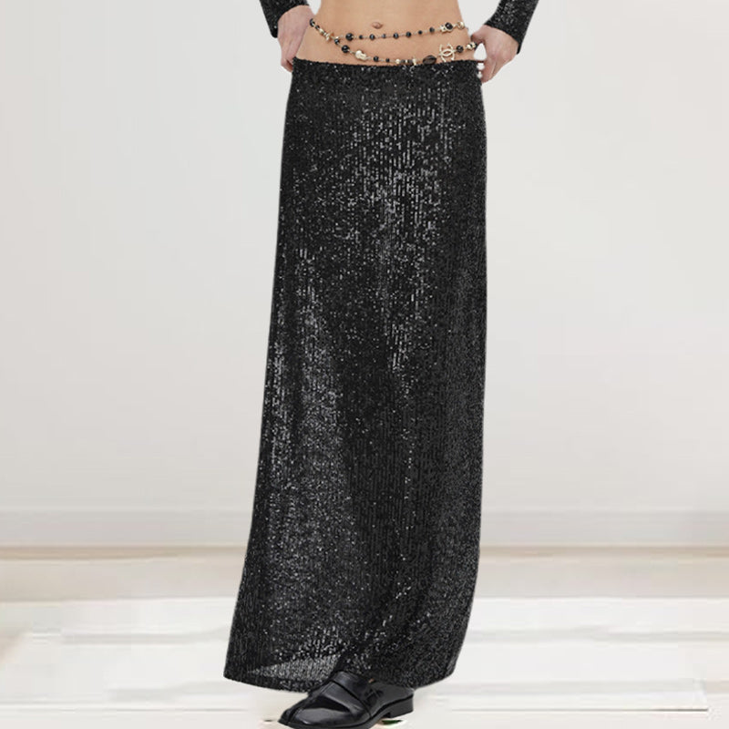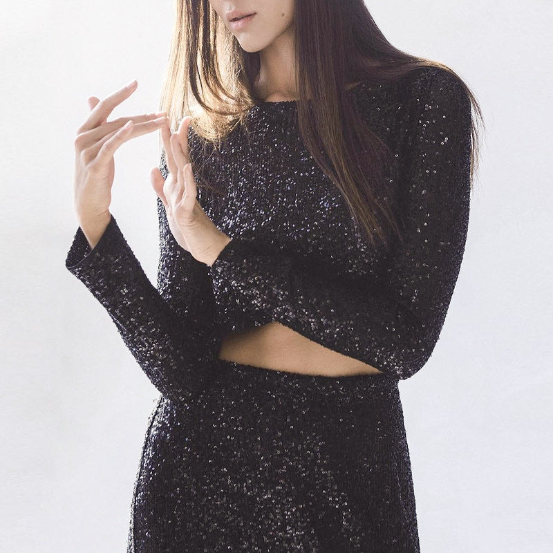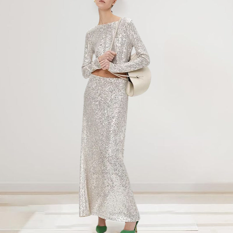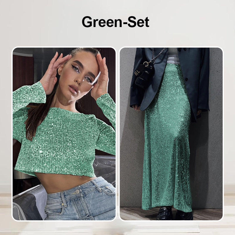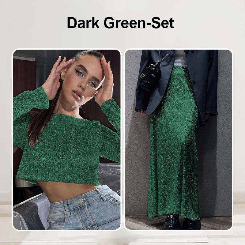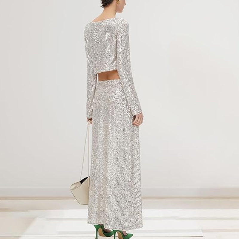 SEXY SHORT TOP - Ontworpen met een sexy kort topje, benadrukt dit setje je figuur terwijl het een gedurfd, modieus statement maakt. De nauwsluitende pasvorm en paillettenversieringen maken het perfect om te combineren met de elegante lange rok, voor een chique, flatterende look.