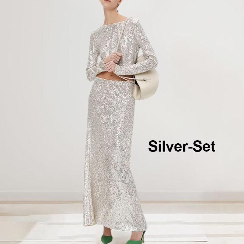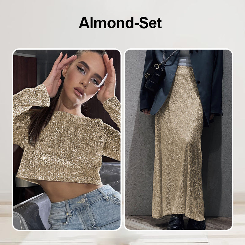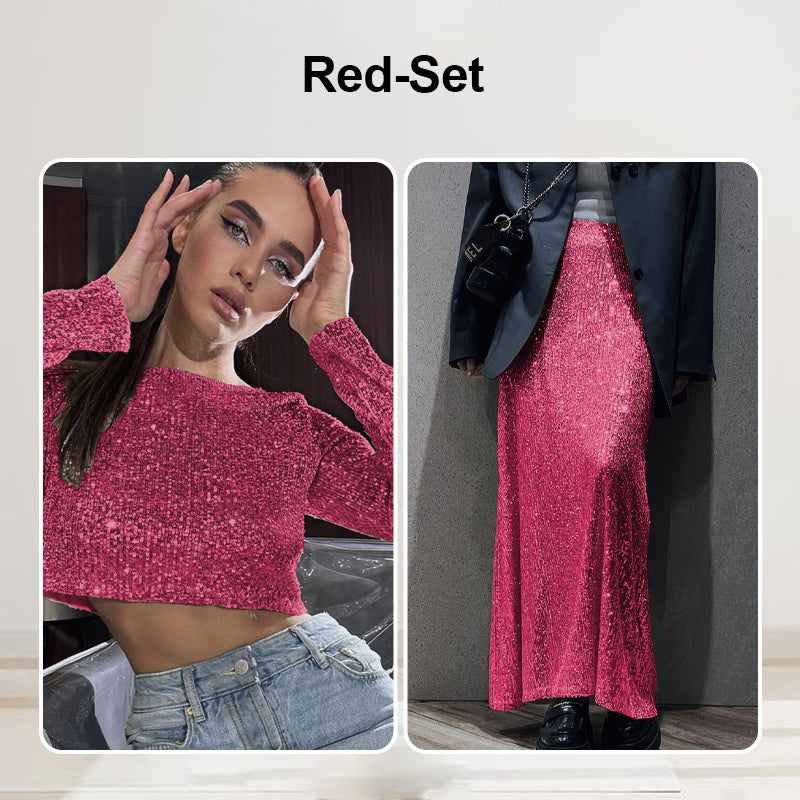 EYE-CATCHING SEQUINS - Deze set is versierd met glinsterende lovertjes die het licht vangen en een vleugje glamour aan je outfit toevoegen. Perfect voor avondevenementen, dit paillettendetail zorgt ervoor dat je opvalt met elegantie en stijl, en biedt een oogverblindende look voor elke gelegenheid.